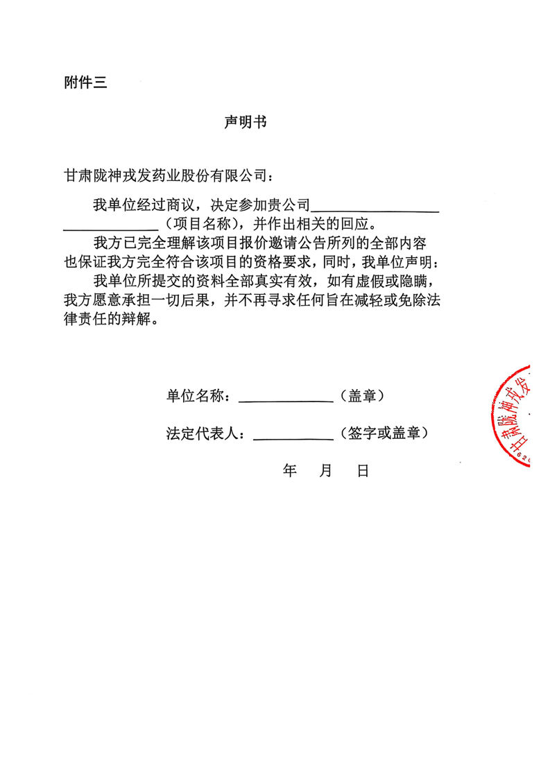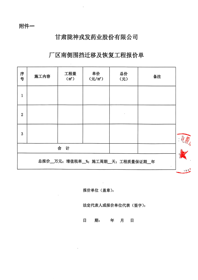 甘肃陇神戎发药业股份有限公司厂区南侧围挡迁移及恢复工程询比采购公告