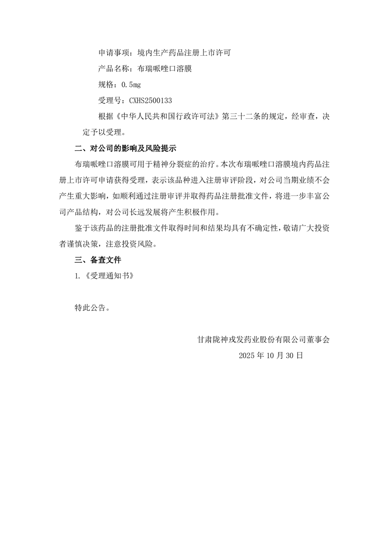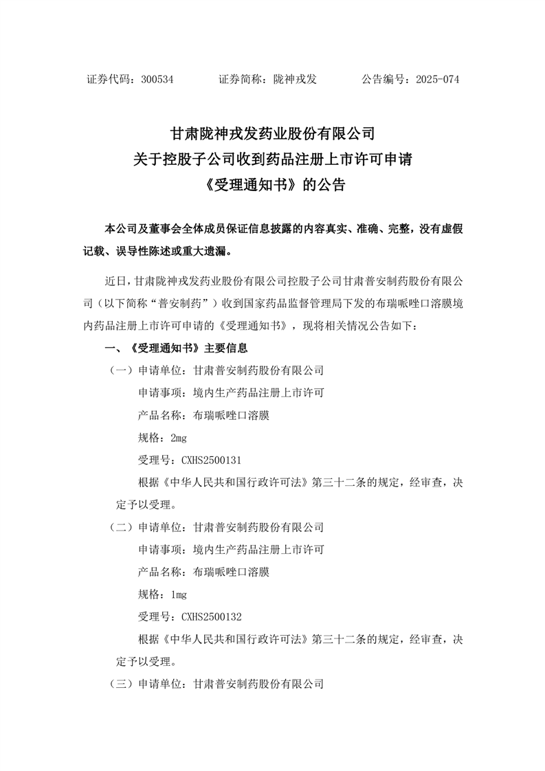 关于控股子公司收到药品注册上市许可申请《受理通知书》的公告